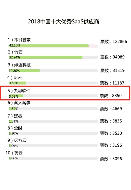 根据投票结果显示,截至1月17日晚24时00分,本次2018最值得关注的10大SaaS厂商排名分别为本能管家、竹云、绿盟科技、听云、九思软件、薪人薪事、泛微、全时、亿方云和码云。纵观这几日的榜单情况及全网投票最终结果不难发现,10大SaaS厂商中仅有两名OA厂商,且九思软件在OA厂商中排名第一位,两者相差5015票。