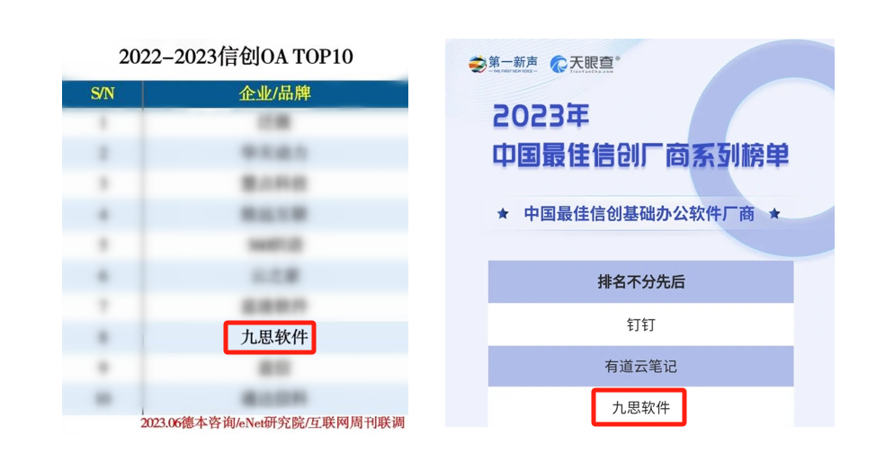 在2023年发布的中国科学院《互联网周刊》、德本咨询及eNet研究院联合调查的《2022-2023信创OA·TOP10》榜单中,九思软件实力入选TOP10榜单。同期,第一新声联合天眼查发布的《2023年中国最佳信创厂商系列榜单》中,九思软件实力入选“2023年中国最佳信创基础办公软件厂商”榜单。