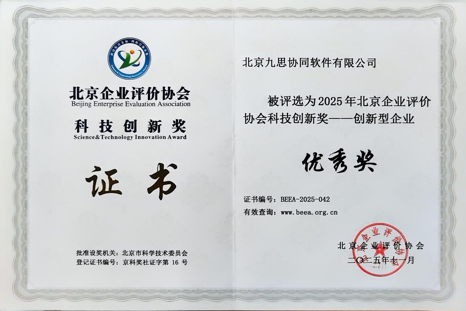 近日,九思软件凭借技术研发、产品创新与行业赋能的综合实力,成功荣获由北京企业评价协会颁发的 “2025 年北京企业评价协会科技创新奖 —创新型企业优秀奖”证书。