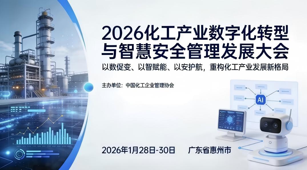 1 月 28 日,中国化工企业管理协会主办的 “2026 化工产业数字化转型与智慧安全管理发展大会” 将在惠州召开。大会以 “以数促变、以智赋能、以安护航,重构化工产业发展新格局” 为主题,聚焦化工行业数字化转型、智能化管理新趋势,结合人工智能技术应用现状,探讨化工企业及园区数字化转型、智慧安全管理、“人工智能 +” 行动的核心痛点与解决方案。