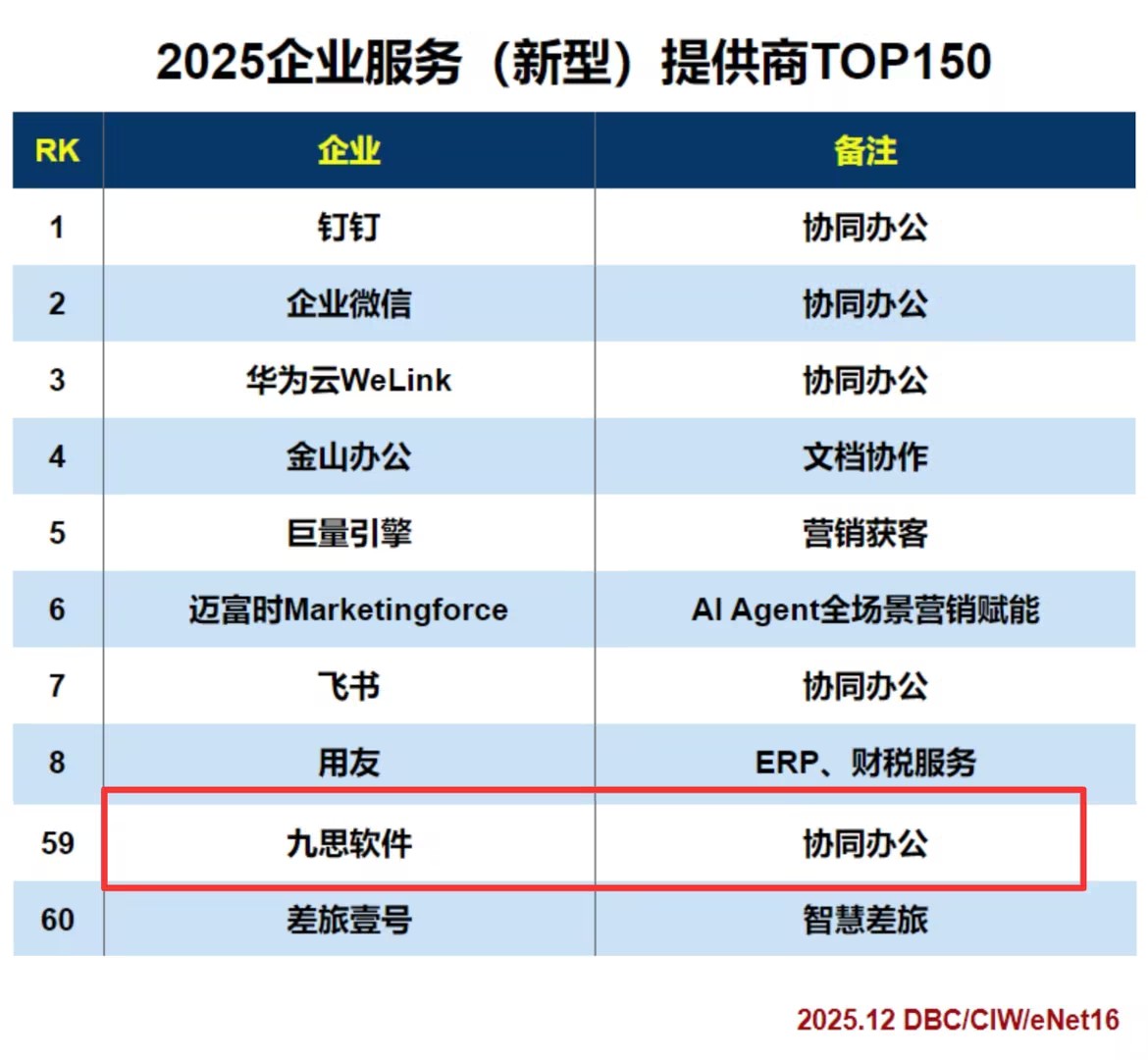 2025年12月,德本咨询(DBC)、中国科学院《互联网周刊》(CIW)、eNet硅谷动力联合发布2025企业服务(新型)提供商TOP150榜单,九思软件凭借协同办公领域突出的技术创新实力、全场景服务能力与标杆案例实践,成功入选该榜单。
