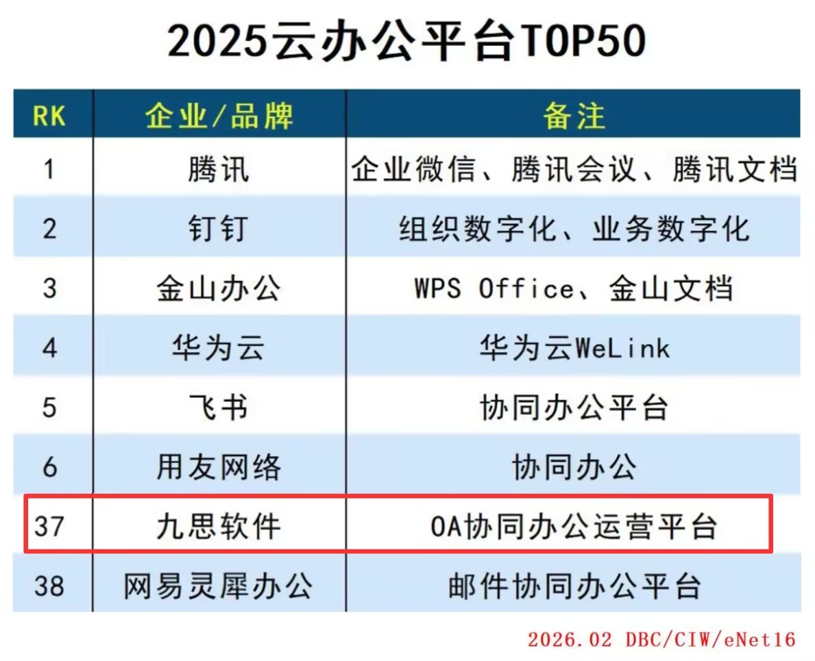 近日,DBC德本咨询与《互联网周刊》联合发布“2025云办公平台TOP50”榜单,九思软件凭借成熟的协同办公运营平台、领先的云技术架构与丰富的政企行业落地经验成功上榜,再次印证了公司在云办公、协同办公领域的核心竞争力与行业权威认可度。