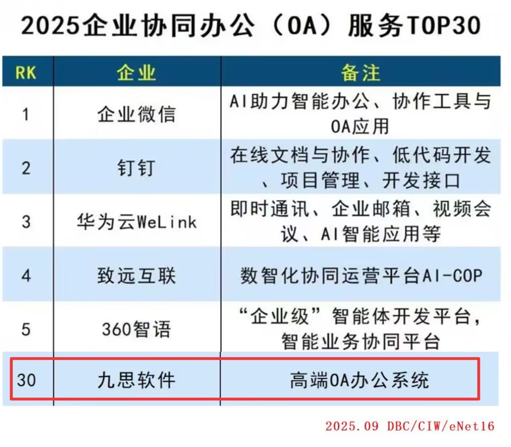 2025年9月,DBC德本咨询与《互联网周刊》联合发布“2025企业协同办公(OA)服务TOP30”榜单,九思软件凭借自研的智能协同办公系统、深耕行业的技术积累与丰富的政企数字化落地实践成功上榜,彰显了公司在企业协同办公领域的硬核实力与行业认可度。