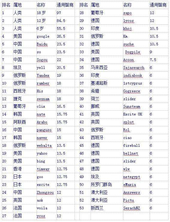 今年5月份,互联网X实验室利用一个机器与人类通用智商测试题库对全世界50个搜索引擎和3个不同年龄阶段的人类群体进行测试得到结果如下: