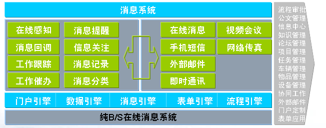 中信银行OA即时通讯子系统为纯B/S在线消息,消息可以作为引擎被所有模块调用,同时,消息可以作为企业微博,被所有模块用来关注和跟踪。