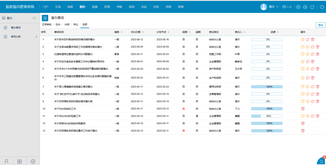 实现督办事项从立项登记、任务分解、进展汇报、延期/办结事项申请、对办结的事项进行考核评价到提交督办报告、对各类数据进行分析研判、关键节点触发消息提醒相关人员、根据办理要求临时催办督办、统计分析等督查事项全生命周期管理。