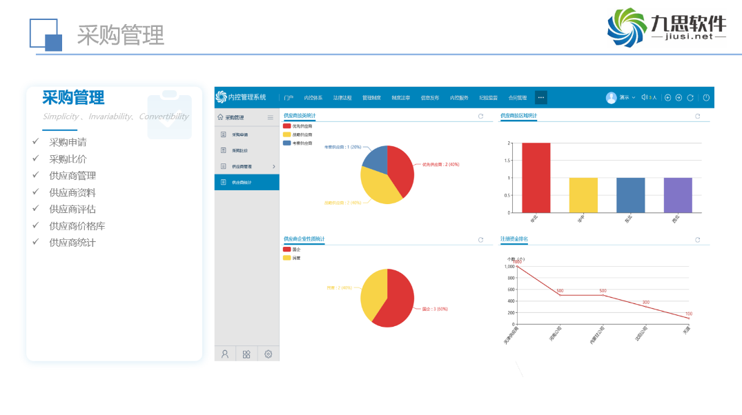 高效、高质、规范的采购管理模块,能够协同内部采购人员和外部供应商,实现采购申请、采购比价、供应商管理等功能,减少数据重复录入,降低成本、提高采购效率。
