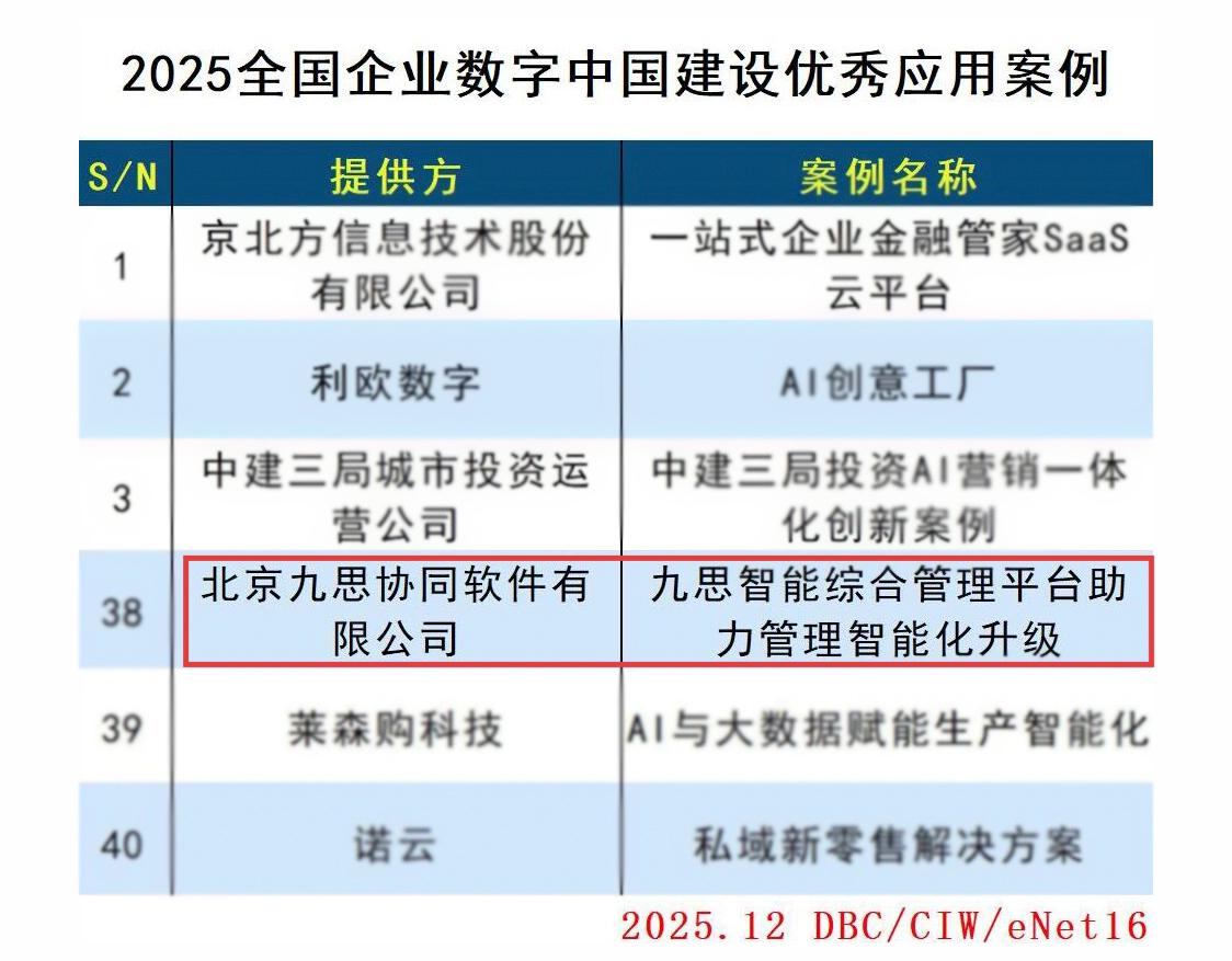 近日,DBC德本咨询、中国科学院《互联网周刊》、 eNet 研究院联合重磅发布数字中国建设优秀应用案例评选结果。九思软件凭借人民卫生出版社案例,成功入选。